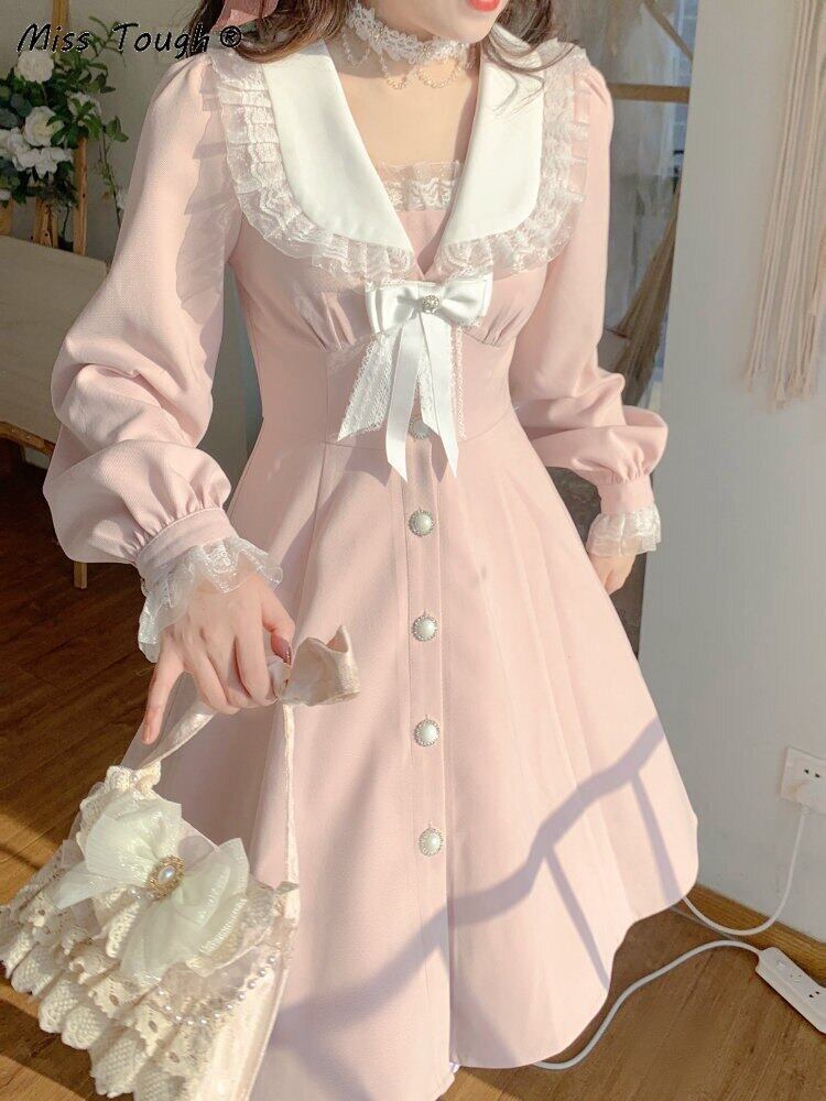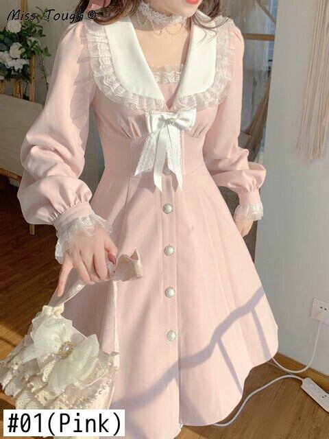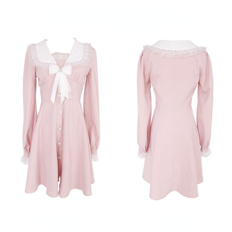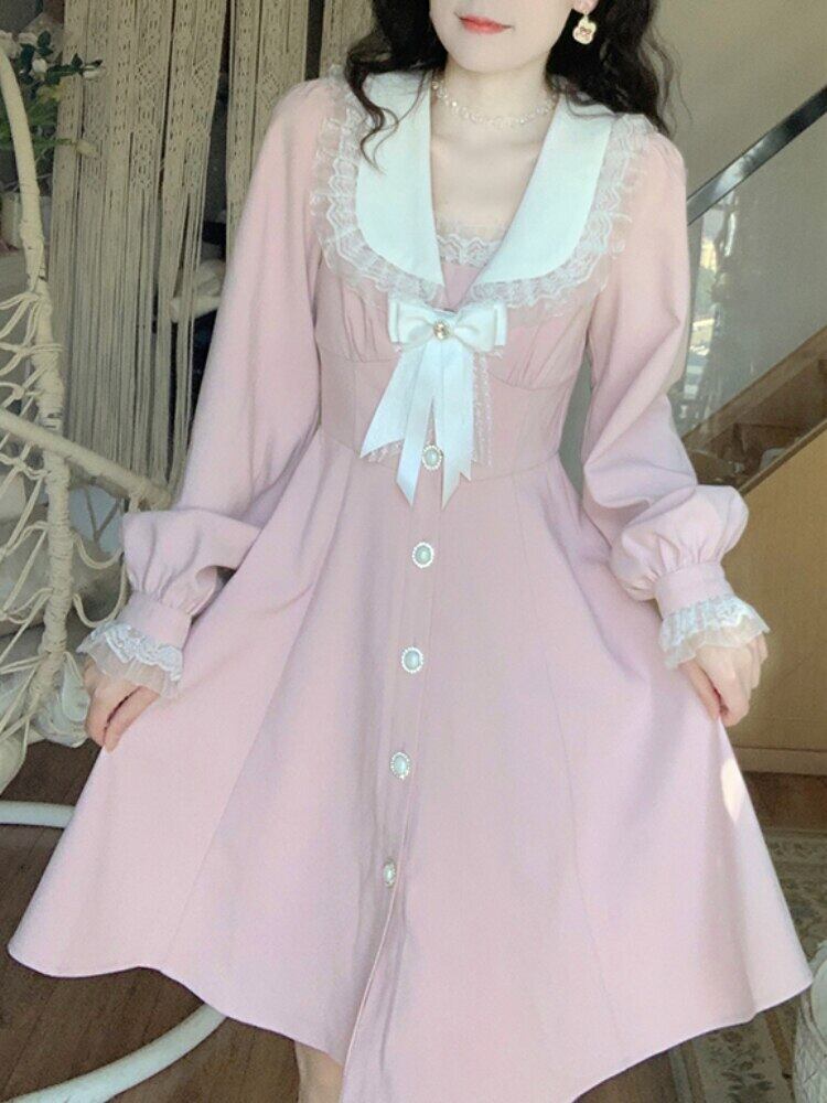 春のピンクの甘いドレスの女性のレースのピーターパンの襟の妖精のドレス長袖フレンチミディドレス ロング 大人ガーリー スウィート キュート カジュアル スプリング 春物 bel72554696033