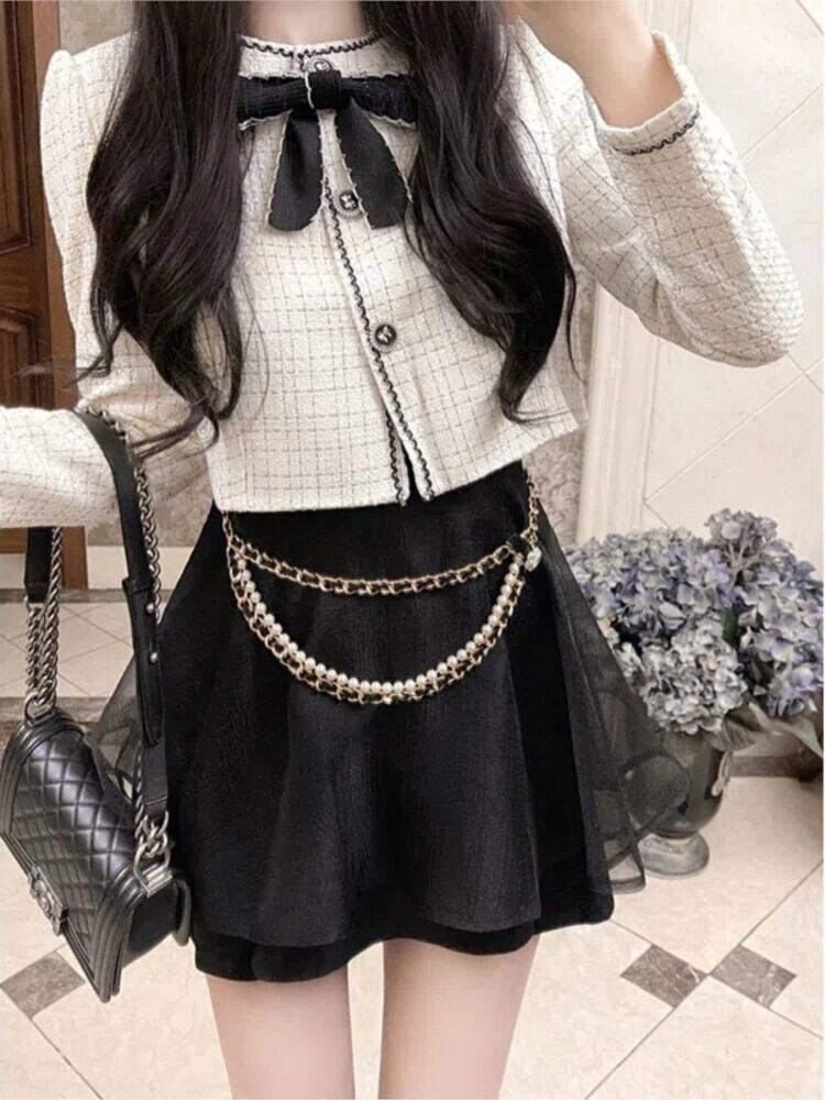 春ツイードジャケットメスクスカート 2 点セット女性甘いミニスカートスーツ白チェック柄コートセット ホワイト 大人ガーリー スウィート キュート カジュアル スプリング 春物 bel52093073559 | aliel