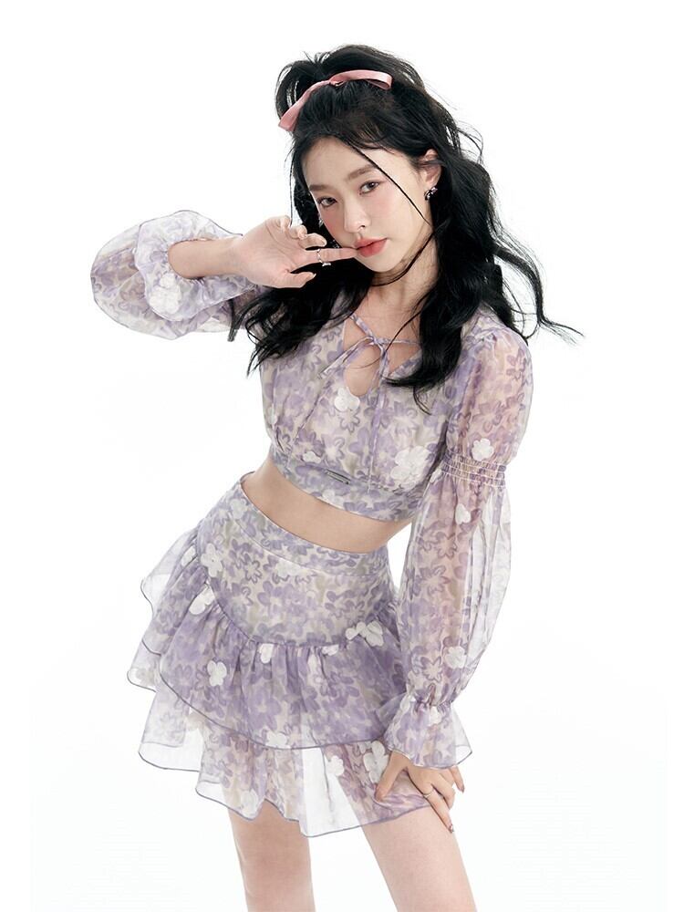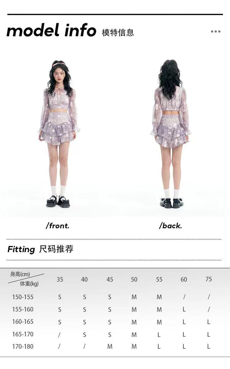 パープルブラウス + ケーキドレス 2 点セット夏メッシュ長袖クロップトップ Y2k スーツ甘いミニスカートスーツ ロング 大人ガーリー スウィート キュート カジュアル サマー 夏物 | aliel