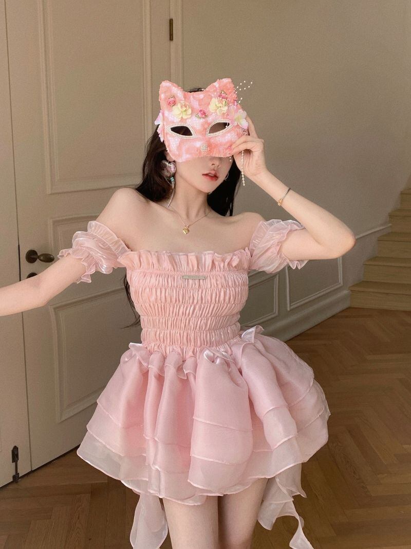 ピンクドレス夏の甘いオフショルダーパフドレスチュチュケーキドレスのウエストスリムセクシーなパーティードレス 大人ガーリー スウィート キュート カジュアル サマー 夏物 パニエ ペチコート | aliel