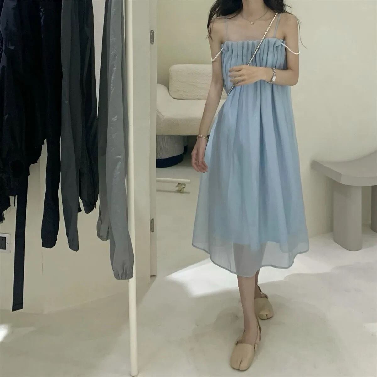 サスペンダーワンピース レディース 夏 セクシー ミディワンピース キュート メッシュ パール ロング キャミソールワンピース 大人ガーリー スウィート カジュアル サマー 夏物 真珠 | aliel