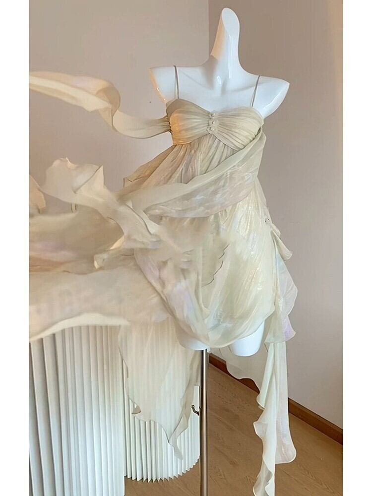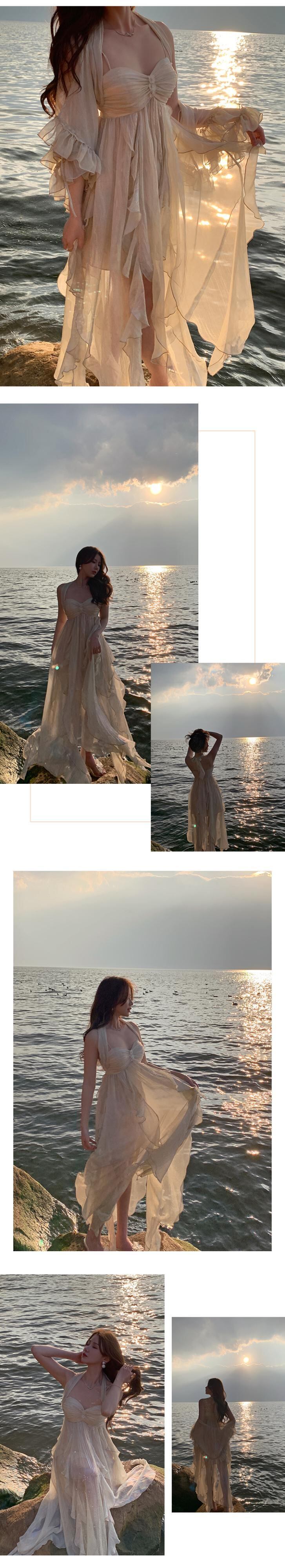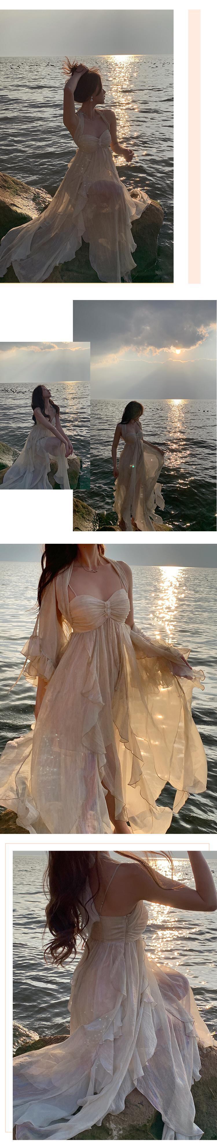 夏ビーチロングサンドレスサスペンダー背中開いたフリル妖精ドレスホリデービーチロマンチックパーティードレス ラッフル サマー 夏物
