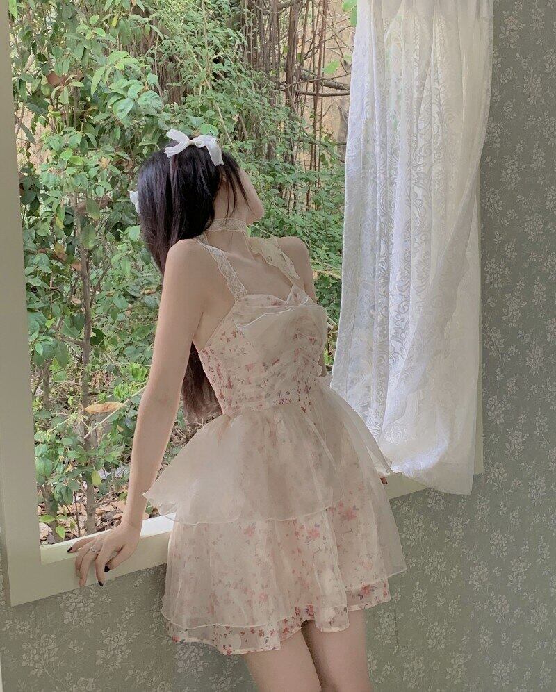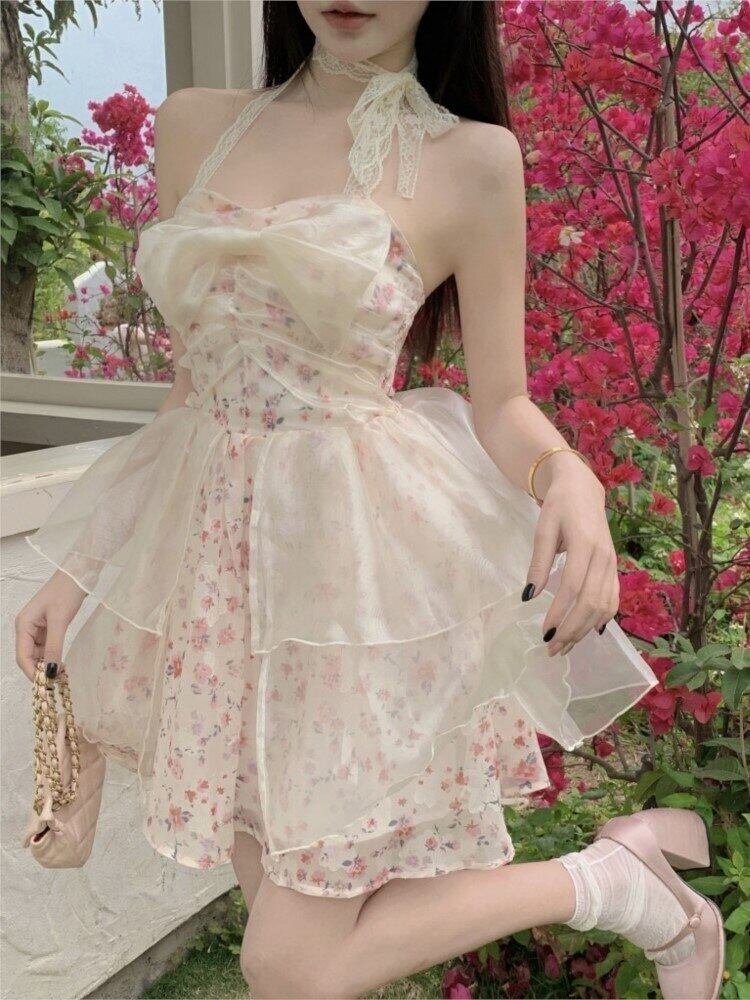 夏フレンチレースホルター花柄弓パーティードレスフリル甘い自由奔放生きるビーチホリデーミニドレスローブ Vestidos リボン ラッフル 大人ガーリー スウィート キュート カジュアル サマー 夏物 | aliel