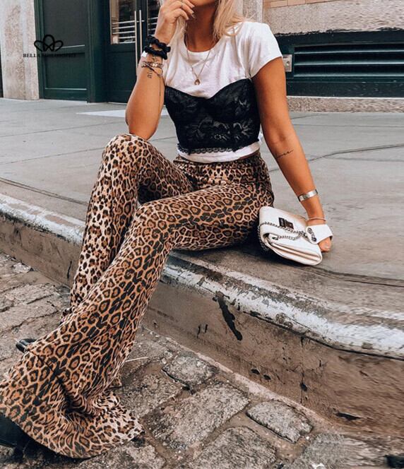 2019 春婦人服新しいハイウエストブロードレッグパンツヒョウセクシーカジュアルパンツスキニー足首丈ズボン ハイウェスト スプリング 春物