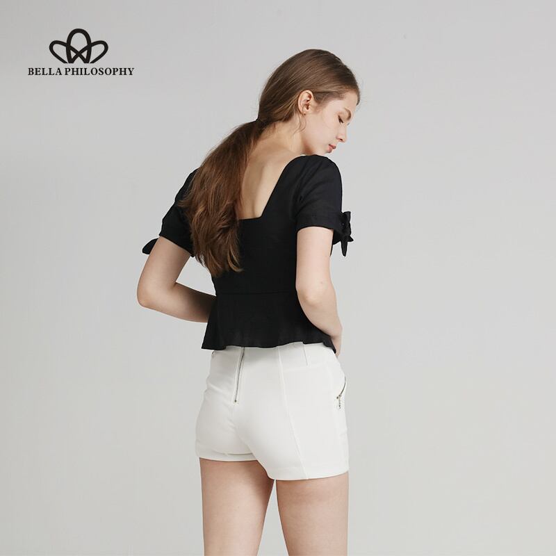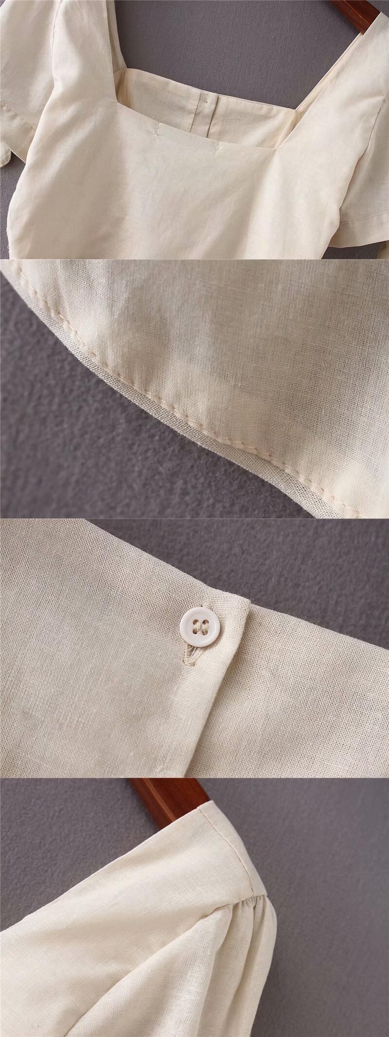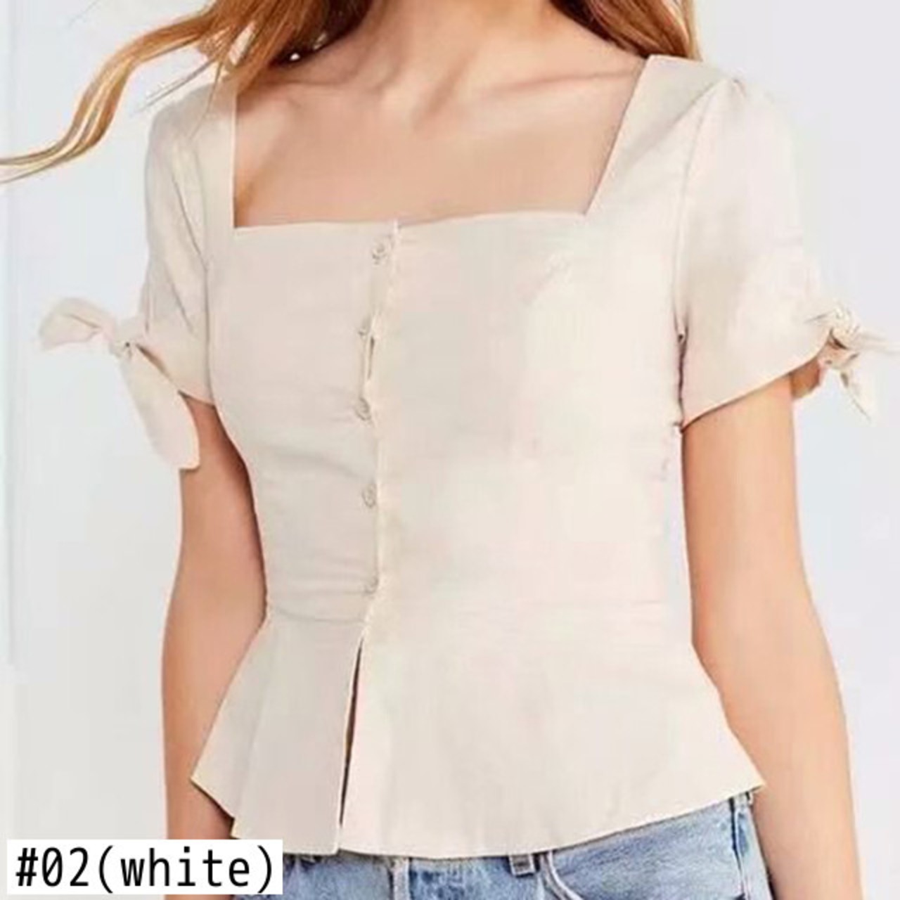 ベラ哲学夏カジュアルコットンリネンスクエアカラーショートスリムブラウスボタン蝶ネクタイスリーブ甘い blusas リボン 大人ガーリー スウィート キュート サマー 夏物 ソリッドカラー スクウェア | aliel