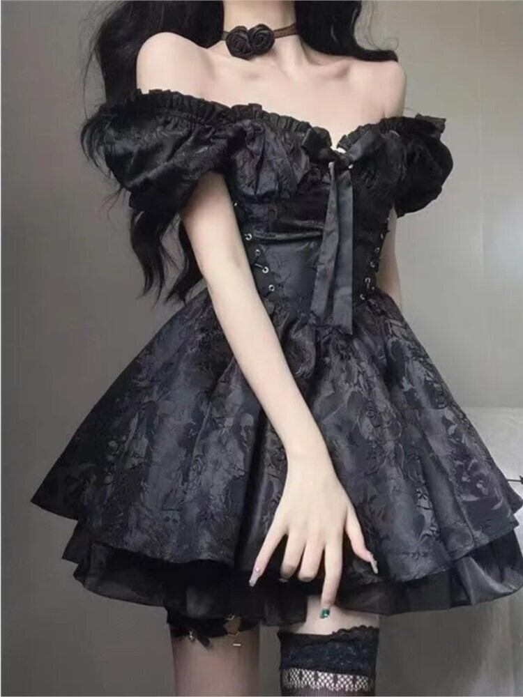 ゴシック ドレスブラック スクエア パフ スリーブ パーティー ドレス a ライン ロリータかわいいミニ ドレス y2k 大人ガーリー スウィート キュート カジュアル Aライン スクウェア | aliel