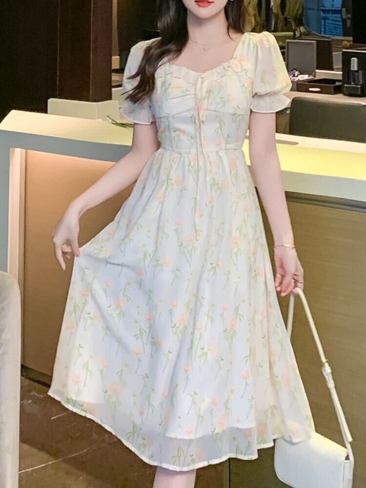 夏プリントシフォンドレス半袖 V ネック甘い妖精ドレス Vestido エレガンテ ドレス機会 ショート ハーフスリーブ 大人ガーリー スウィート キュート カジュアル エレガント サマー 夏物 Vネック | aliel