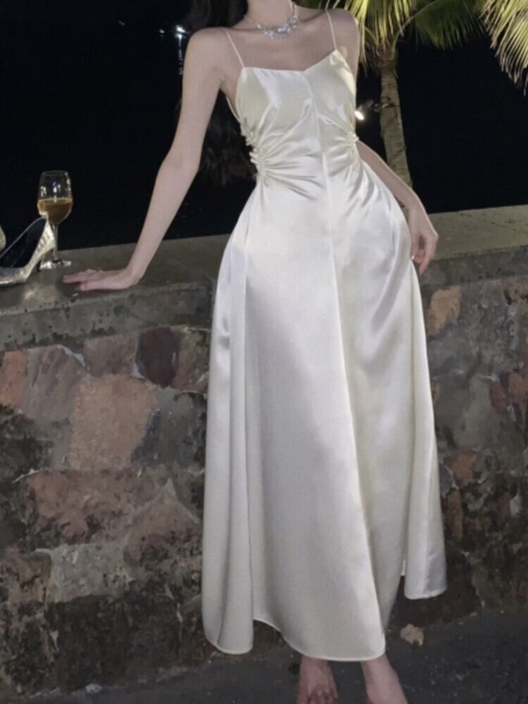 アセテートサテンストラップウェディングパーティードレス背中開いたシルキーロングウエディングドレスクロスオーバーvestidos verano mujerフィエスタエレガントファム フェミニン | aliel