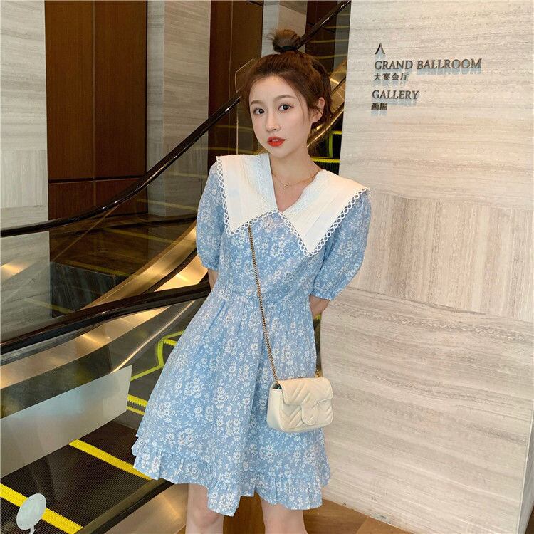 夏半袖 A ラインドレスレディフリルプリントピーターパン襟ドレススウィートビーチ Vestidos ショート ハーフスリーブ ラッフル 大人ガーリー キュート カジュアル サマー 夏物 Aライン | aliel