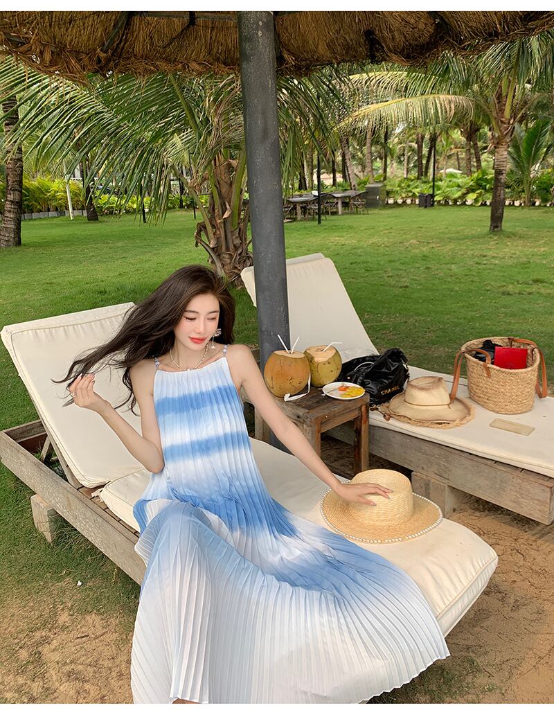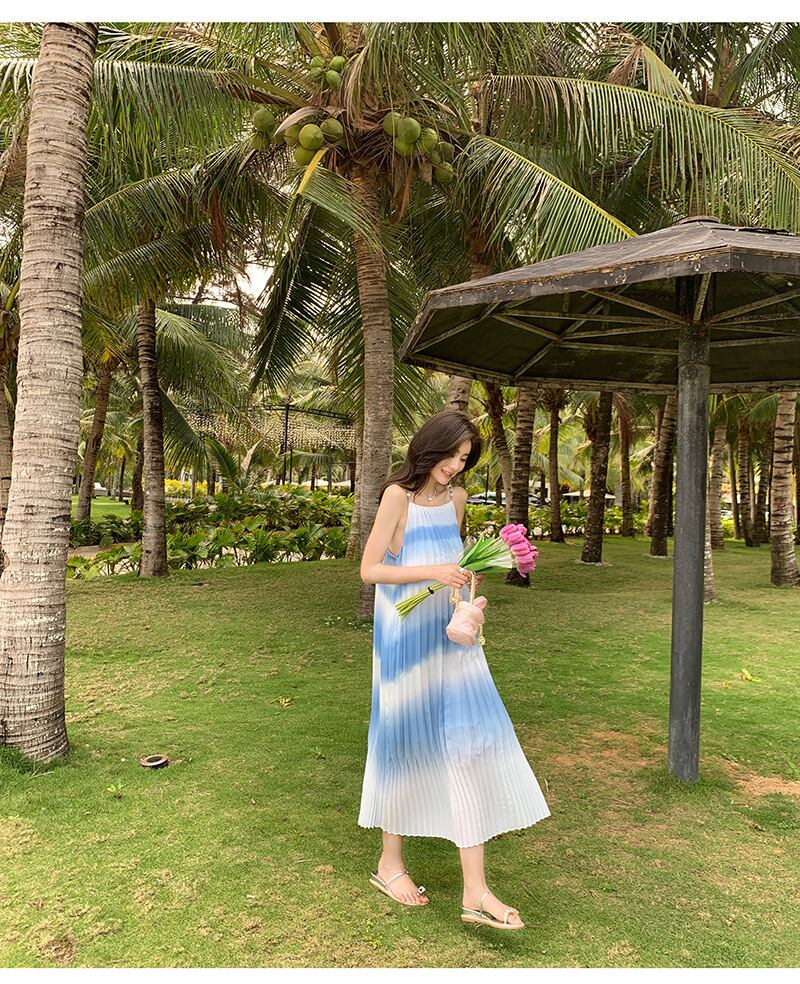 夏ビーチスタイルブルーグラデーションプリーツロングストラップドレス Vestidos エレガンテスパラ ローブデテパーティードレスイブニング エレガント サマー 夏物 長めのストラップ | aliel