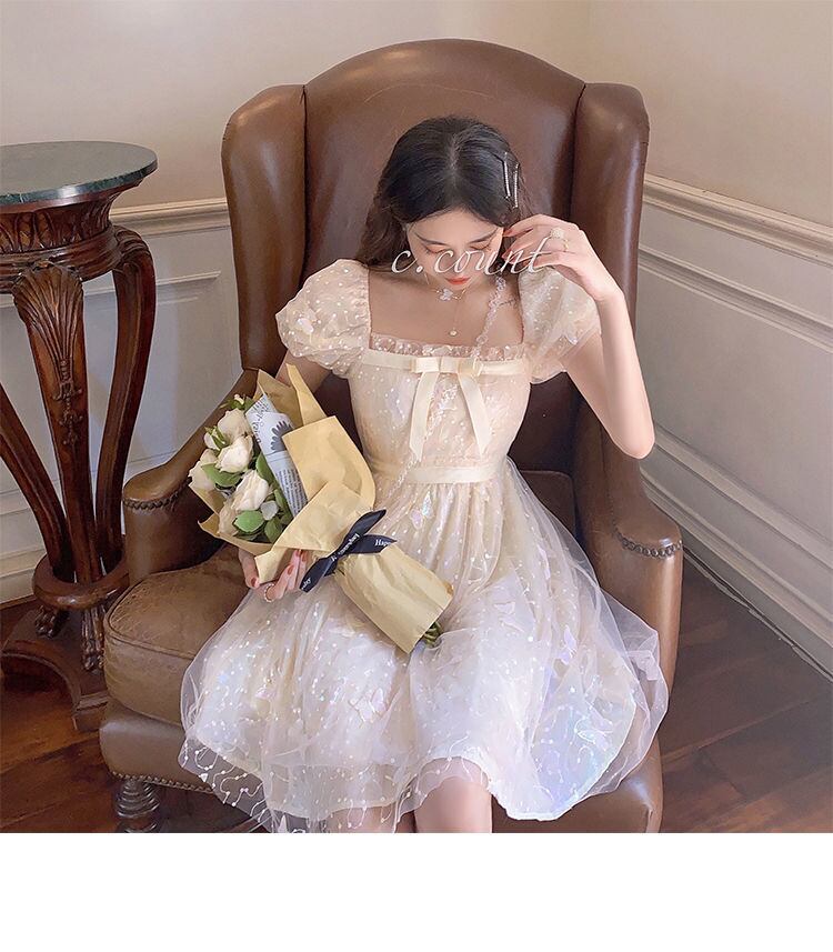 かりシックボウレースビーチドレス夏甘い妖精ドレスレトロ半袖メッシュミニドレス ショート リボン ハーフスリーブ 大人ガーリー スウィート キュート カジュアル サマー 夏物 ソリッドカラー | aliel