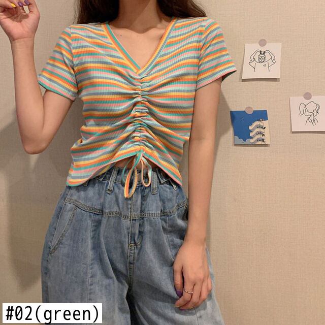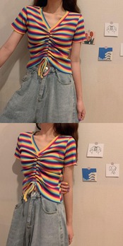 夏ストリートレインボーストライプ Tシャツかわいいトップス V ネック巾着ニットブラウス外出オーマイティトップス 大人ガーリー スウィート キュート カジュアル サマー 夏物 Vネック | aliel