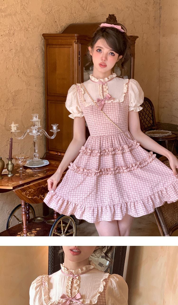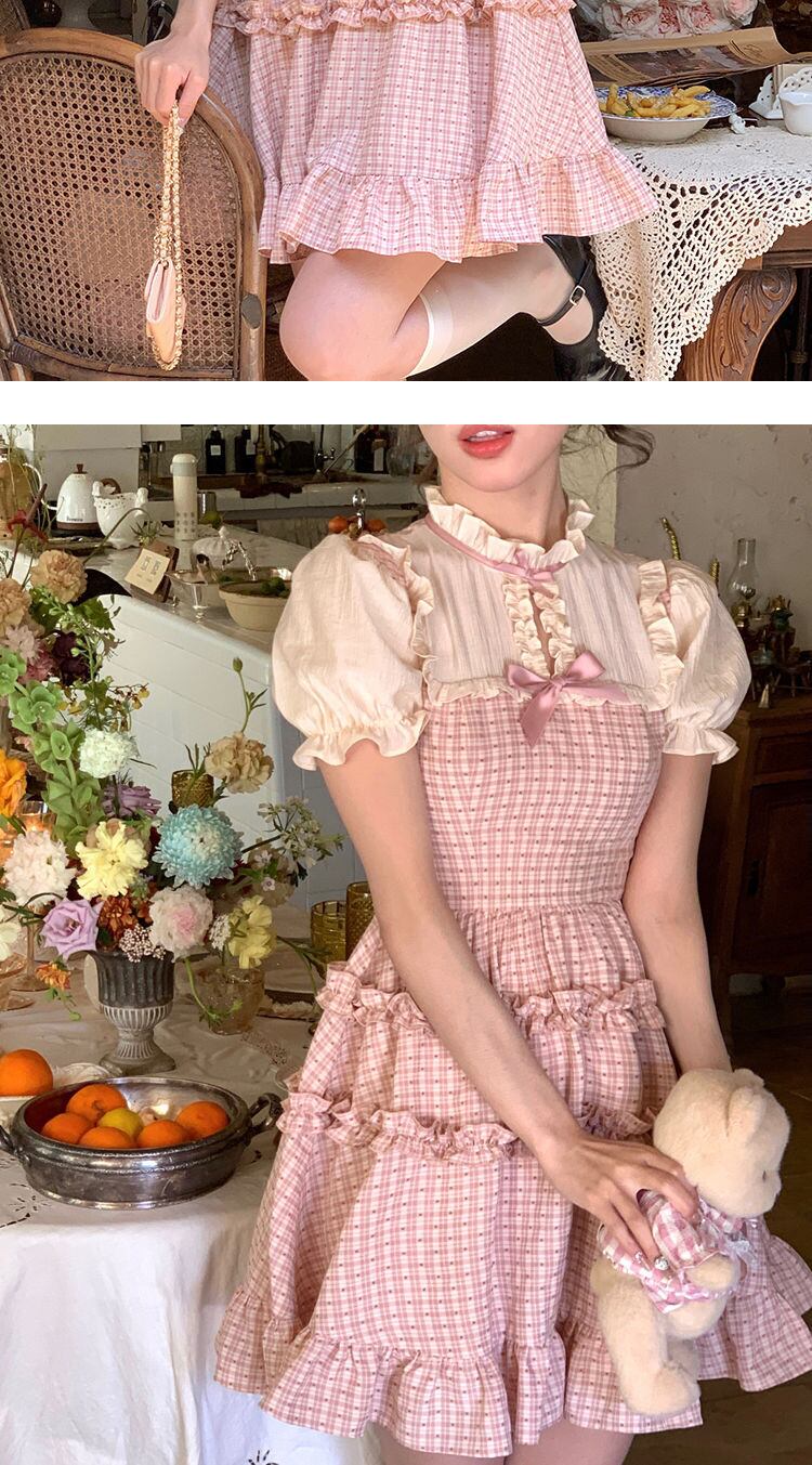 ピンク甘いプリーツプレッピースタイルミニドレスレディチェック柄フリルパッチワークパフスリーブロリータドレスエレガント y2k パーティードレス 大人ガーリー スウィート キュート カジュアル | aliel