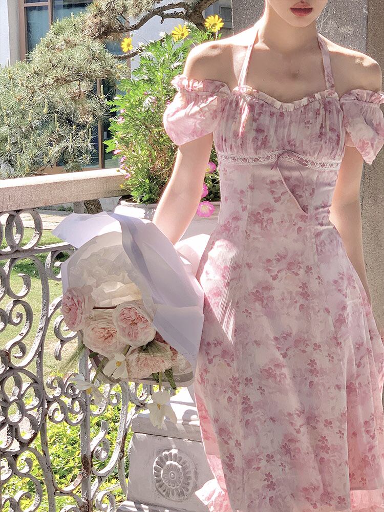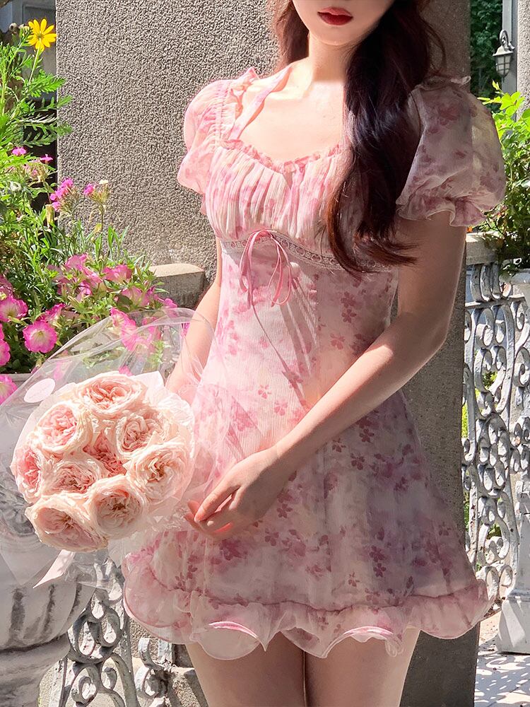 シフォン半袖花柄ミディドレスビーチスタイル夏でもパーティードレスフレンチドレス ショート ハーフスリーブ サマー 夏物