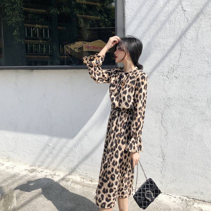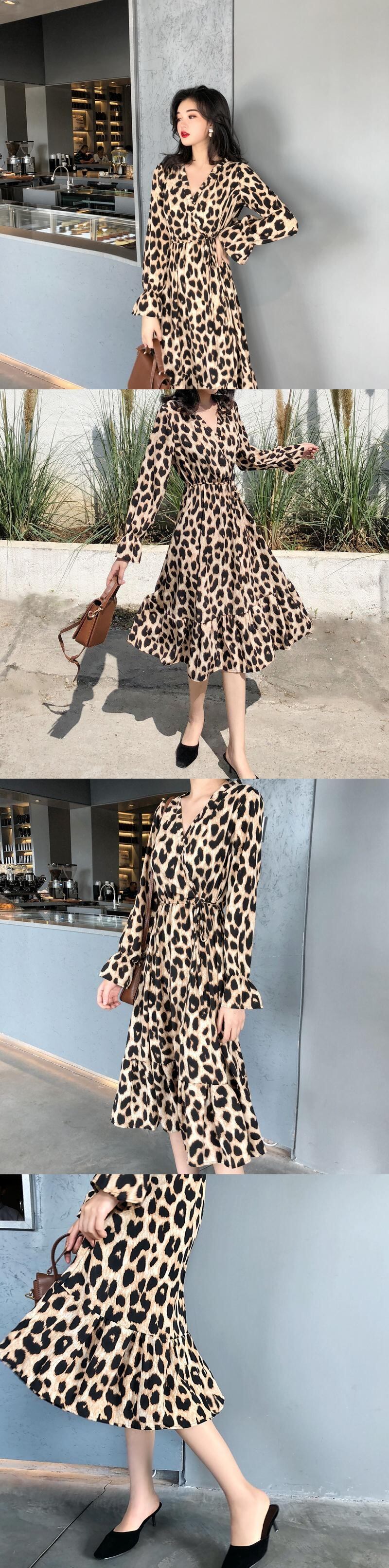 Bella Philosophy 春ヒョウ柄ドレスレディース A ライン長袖リボン V ネック弾性ウエストスリムドレス ロング エラスティック 伸縮 スプリング 春物 Vネック Aライン | aliel