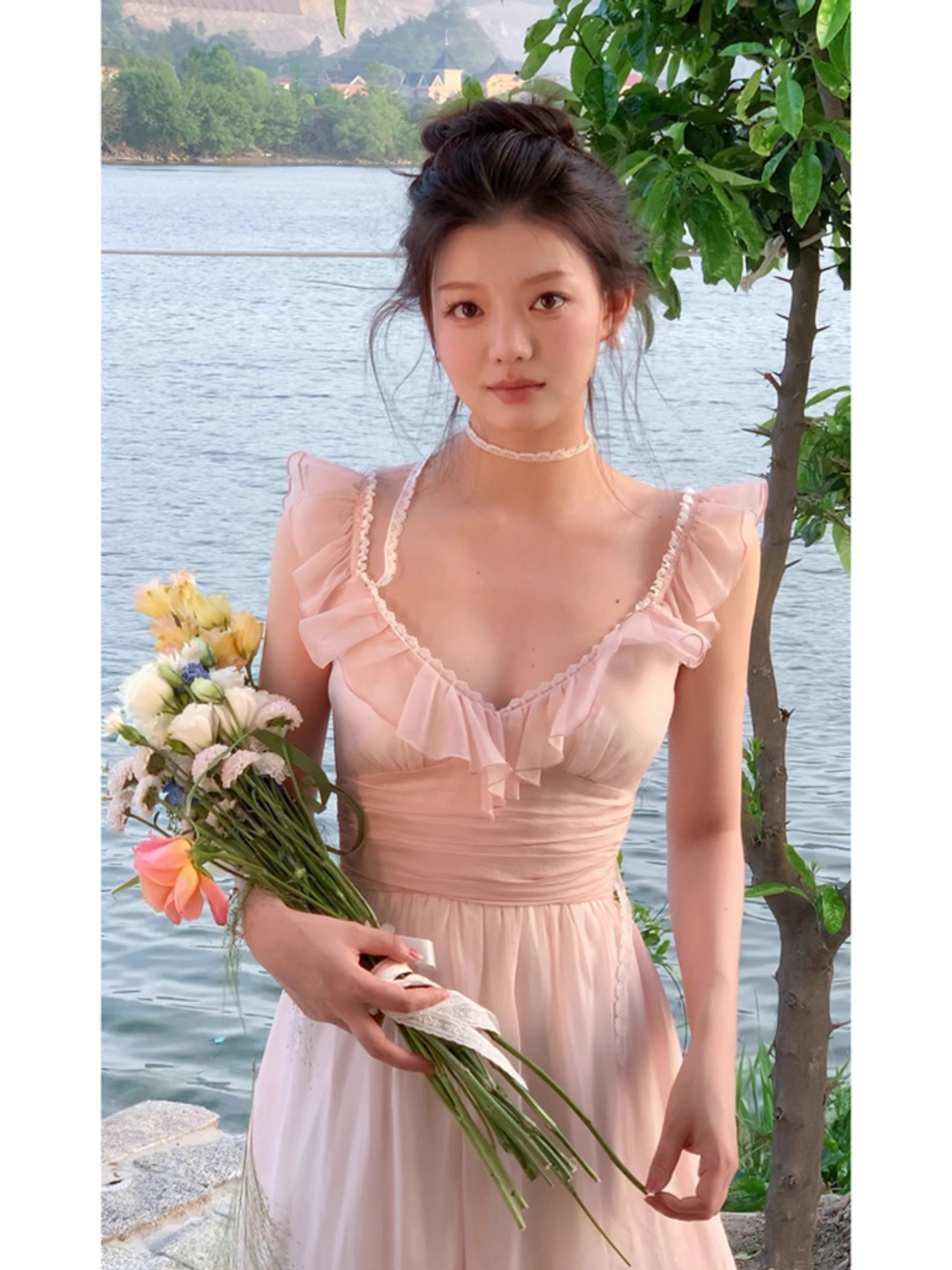フレアスリーブ V ネック誕生日パーティードレス夏ピンク甘い A ラインミディドレスフリルスリムウエディングドレスビーチウェア 大人ガーリー スウィート キュート カジュアル サマー 夏物 Vネック Aライン | aliel