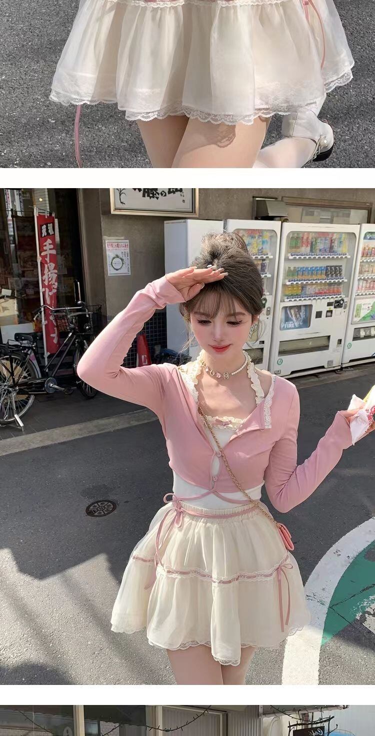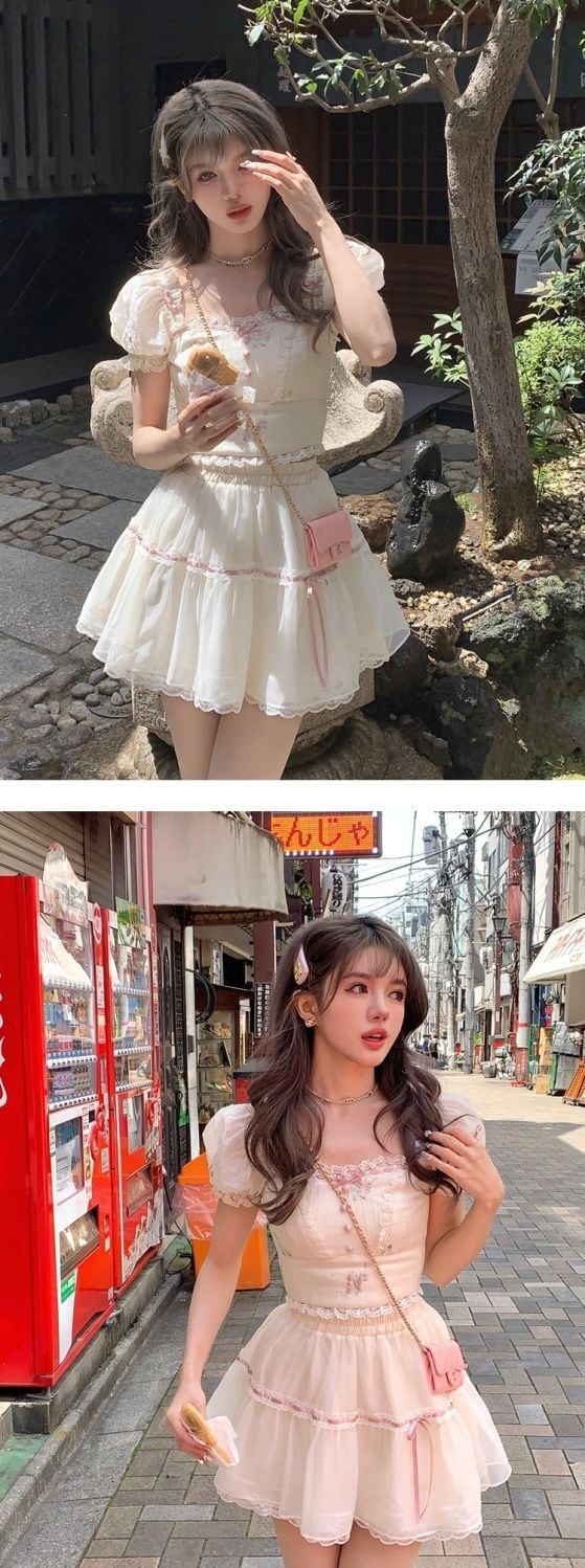 夏甘いスクエアカラーレースクロップトップ 2 ピースセットプリーツチュチュミニスカートセットプレッピースタイルレディ Y2k 衣装 大人ガーリー スウィート キュート カジュアル サマー 夏物 パニエ ペチコート スクウェア | aliel