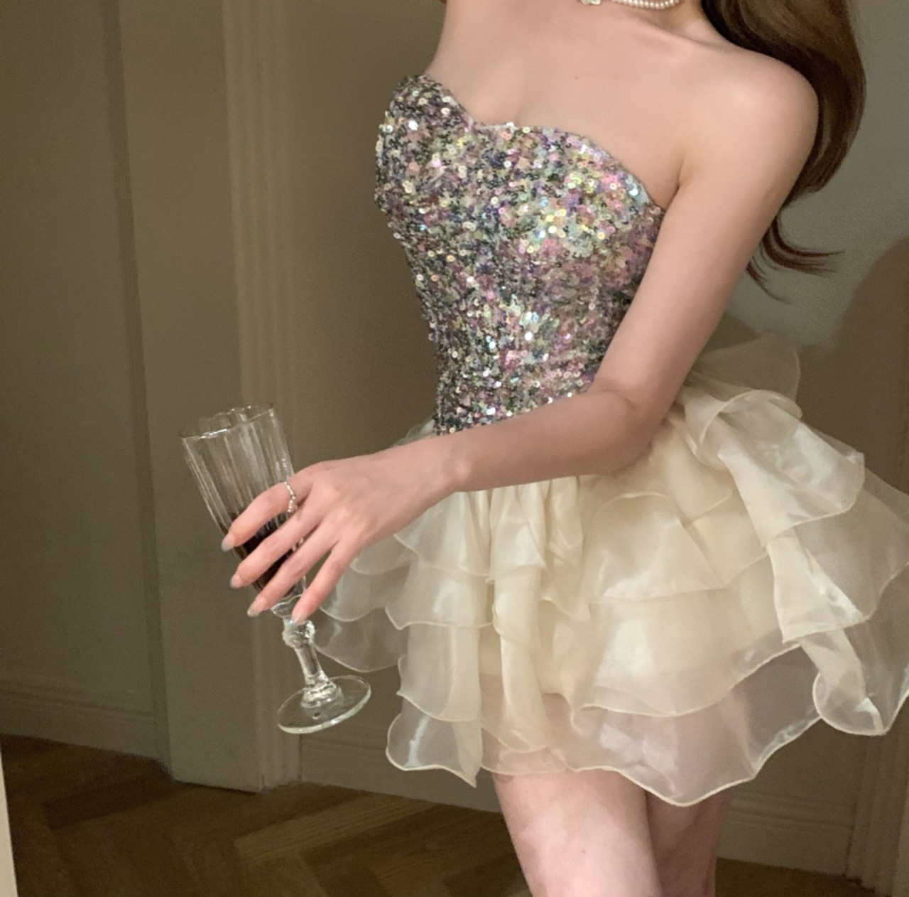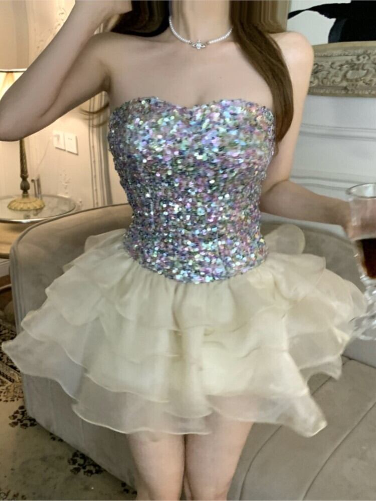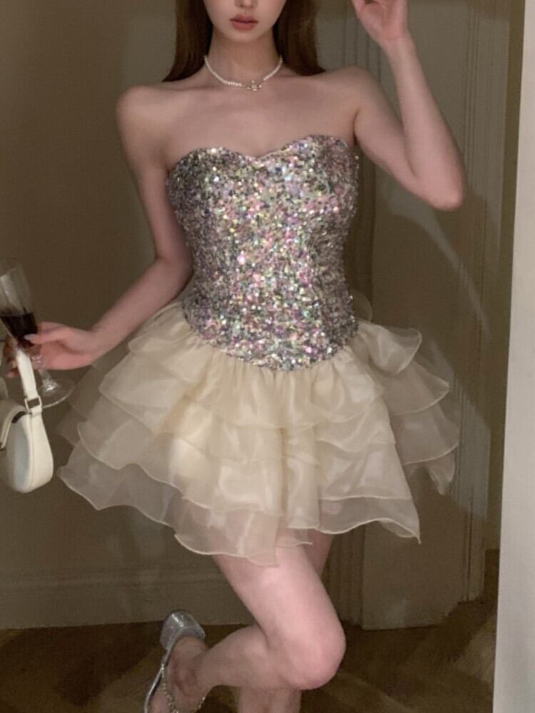 ノースリーブ甘いスパンコールストラップレスドレス夏オーガンザパッチワーク誕生日パーティードレスティアードウエディングドレス レッド 大人ガーリー スウィート キュート カジュアル サマー 夏物 | aliel