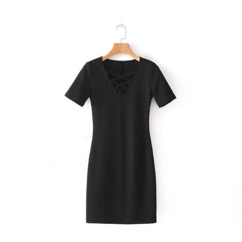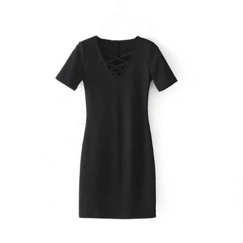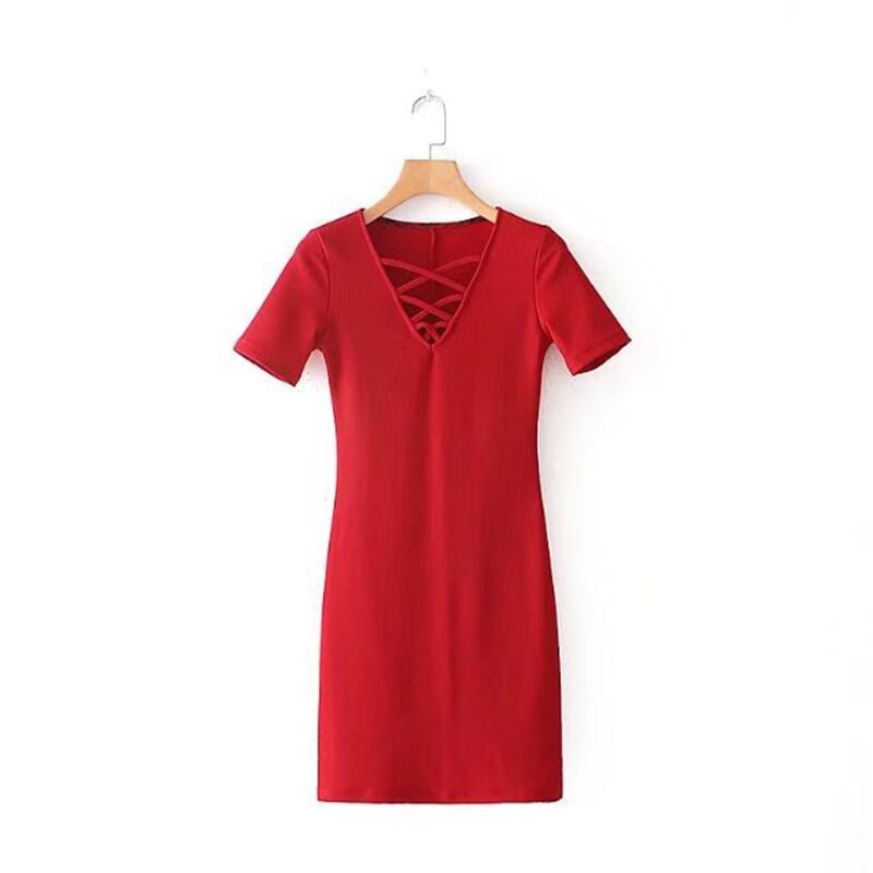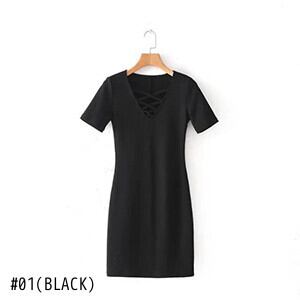 Bella Philosophy 夏カジュアル半袖ドレス黒赤ソリッドペンシルシャツドレス V ネック中空アウトドレス ショート レッド ブラック ハーフスリーブ サマー 夏物 Vネック ソリッドカラー | aliel