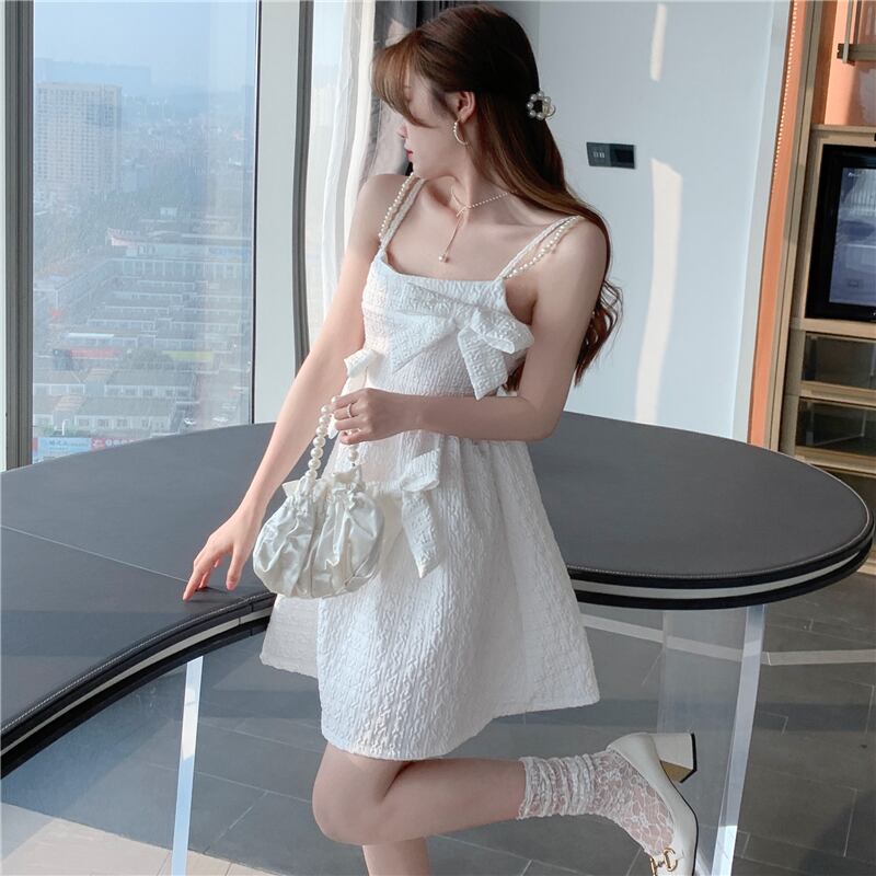 ちょう結びドレスウエスト A ライン白パーティードレスサスペンダー付き夏年齢削減かわいいふくらんショートミニドレス ホワイト 大人ガーリー スウィート キュート カジュアル サマー 夏物 Aライン | aliel