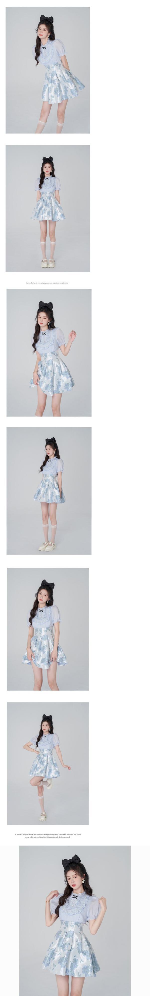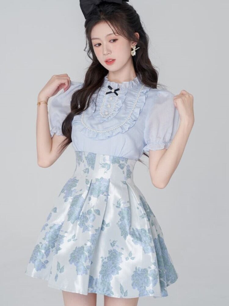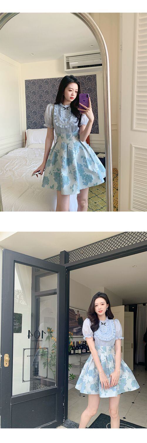 フリルパフスリーブ O ネックブルー甘いかわいいドレス花柄 A ラインミニドレスウエストパッチワークウエディングドレス 大人ガーリー スウィート キュート カジュアル Oネック Aライン | aliel