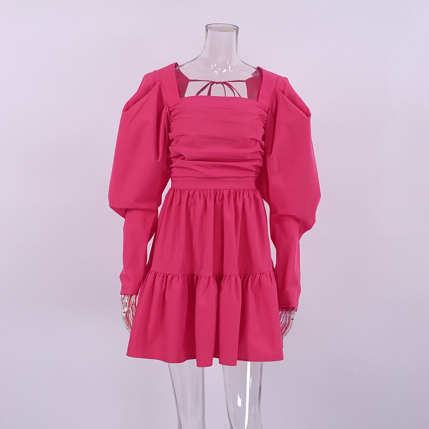 秋スクエアカラーローズレッドミニドレス長袖 A ラインフリルプリーツ甘い誕生日パーティードレス ロング 大人ガーリー スウィート キュート カジュアル オータム 秋物 Aライン スクウェア | aliel