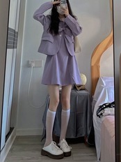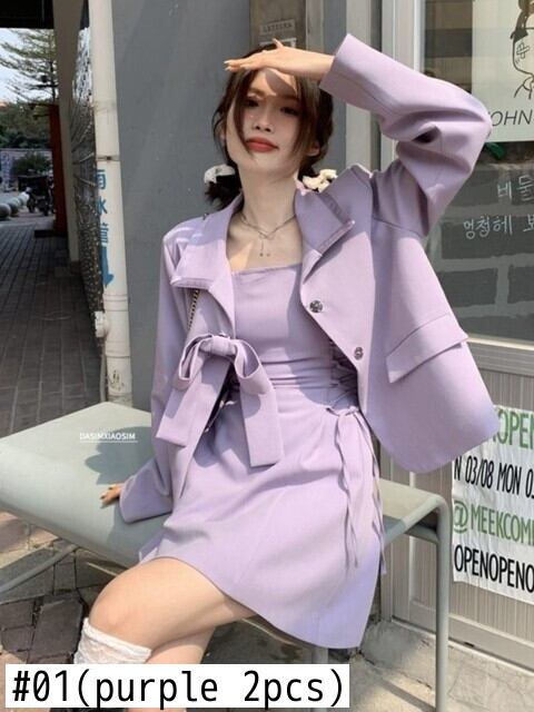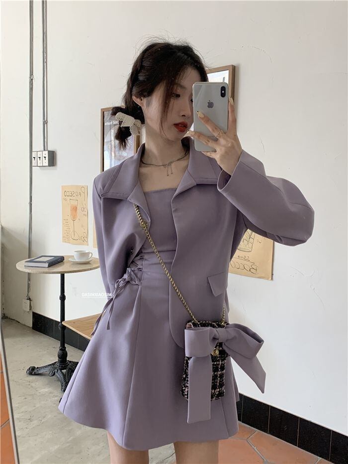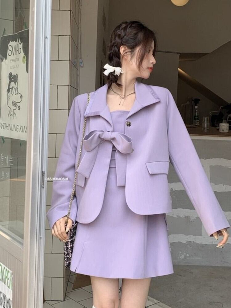 プレッピースタイル秋パープルスーツジャケット + サスペンダードレススーツ甘いオフィスレディレトロリボンツーピースセット 大人ガーリー スウィート キュート カジュアル オータム 秋物 会社 学校 通勤や通学にも | aliel