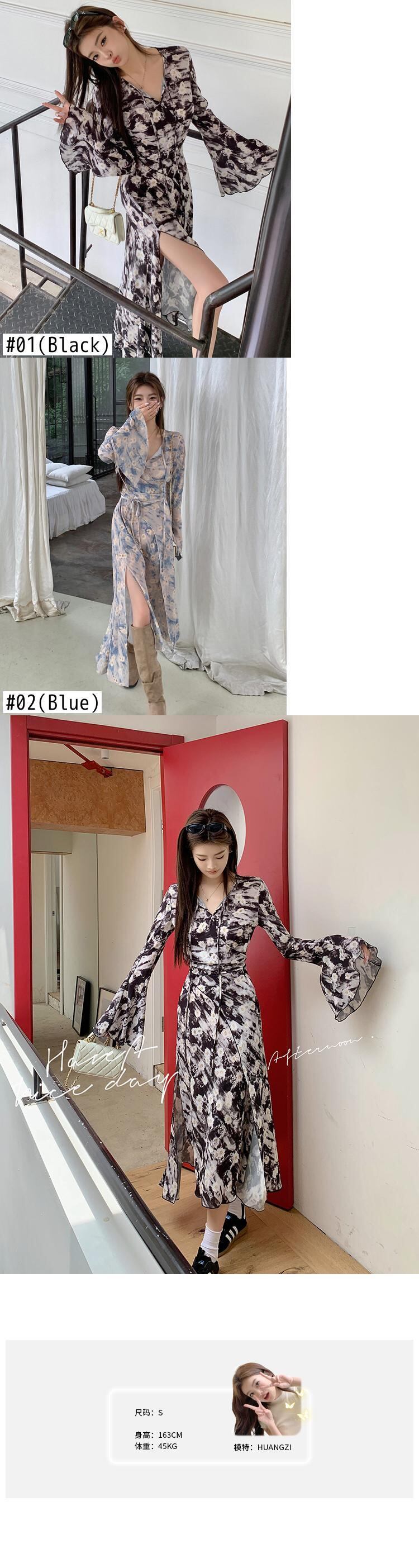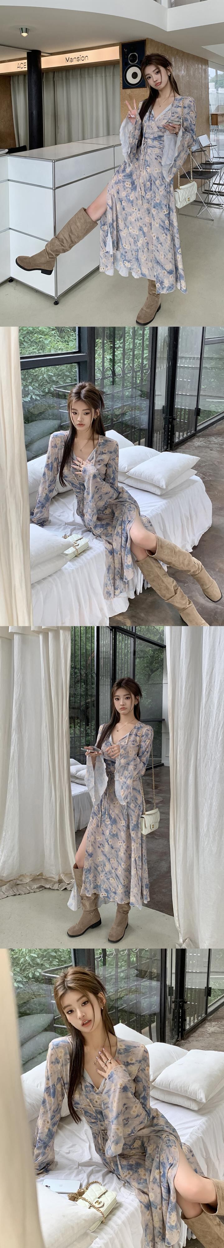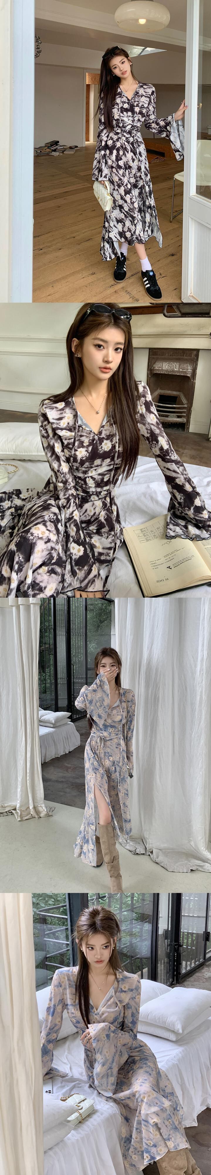 春秋甘いフラワープリントミディドレスフレアスリーブレースアップ不規則スプリットドレス自由奔放生きるフレンチレトロ 大人ガーリー スウィート キュート カジュアル スプリング 春物 オータム 秋物 フラワーデザイン | aliel
