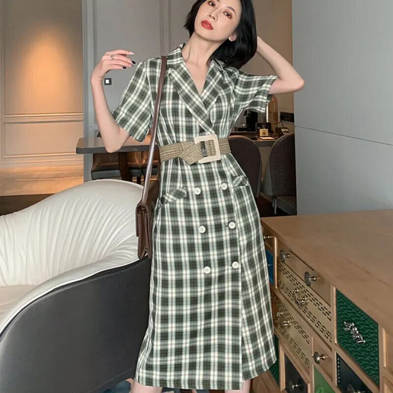 Bella Philosphy 夏半袖チェック柄ドレスベルト付きストレートドレスストリートオフィスレディvestido ショート ハーフスリーブ サマー 夏物 ハーネス 会社 学校 通勤や通学にも | aliel