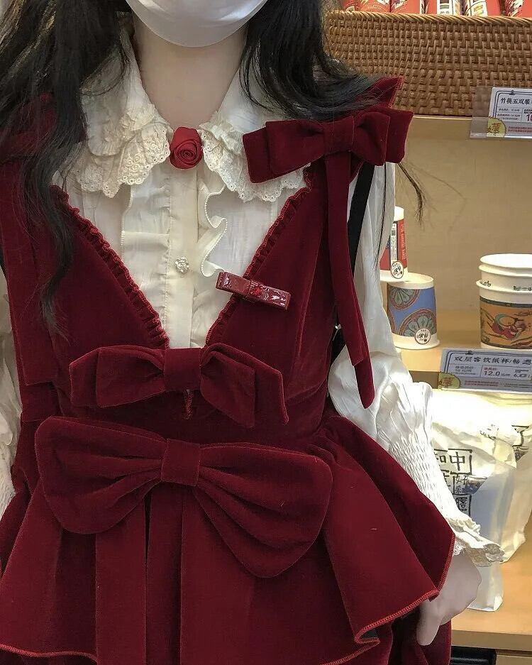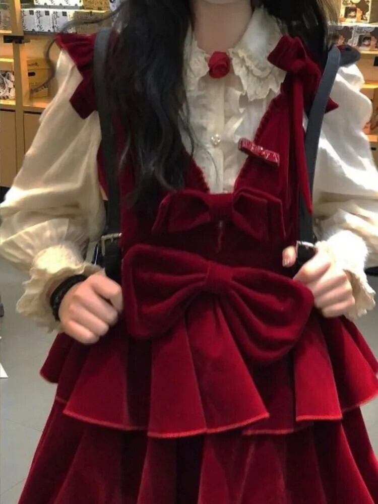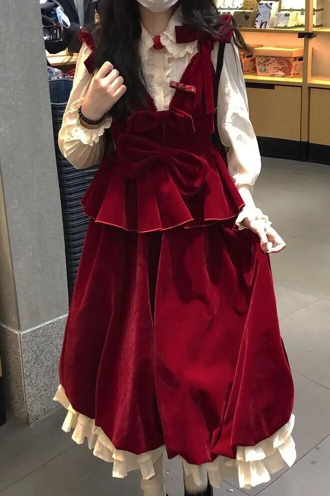 甘い弓フリル A ライン クリスマスかわいいプレッピー ドレス ビッグ スイング ベルベット芽スカート ドレス セット ツーピース スーツ リボン ラッフル 大人ガーリー スウィート キュート カジュアル Aライン | aliel