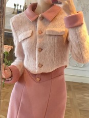 フレンチスタイルピンクスウィートスカートセットターンダウンカラーシングルブレストジャケットクロップトップ+ソリッドミディスカート2点セット 大人ガーリー キュート カジュアル ソリッドカラー | aliel