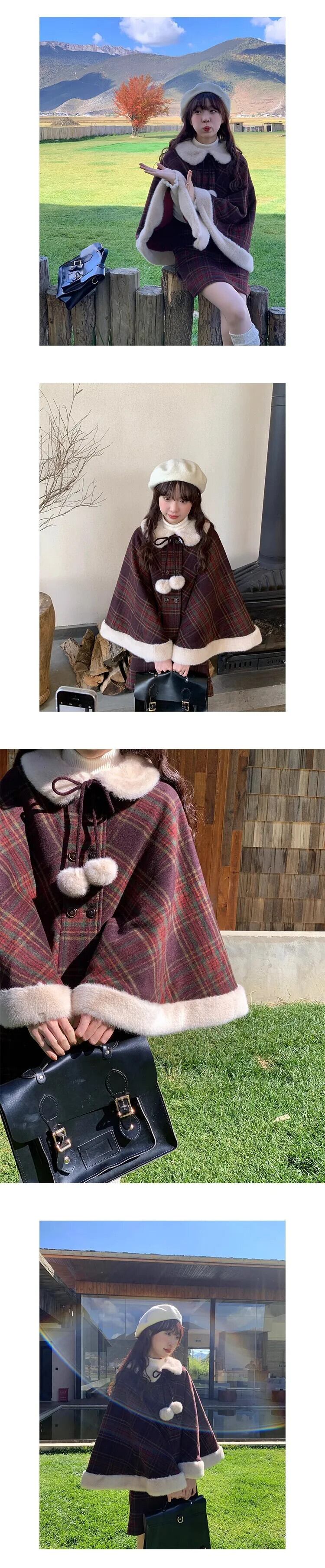 冬 ese 甘いチェック柄フェイクファーパッチワークマント + ミニスカート 2 点セット毛皮襟暖かいクリスマスセット 大人ガーリー スウィート キュート カジュアル ウィンター 冬物 | aliel