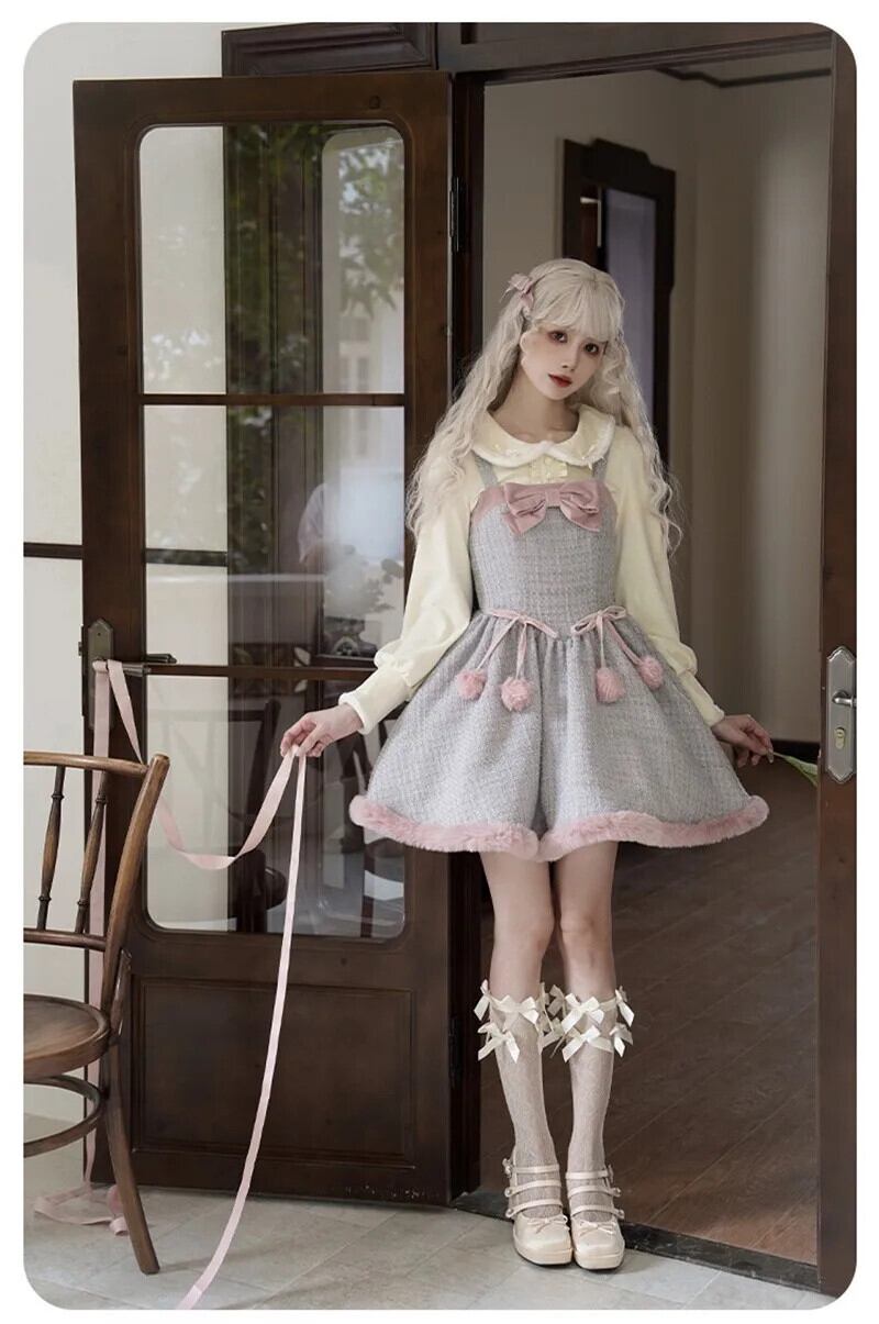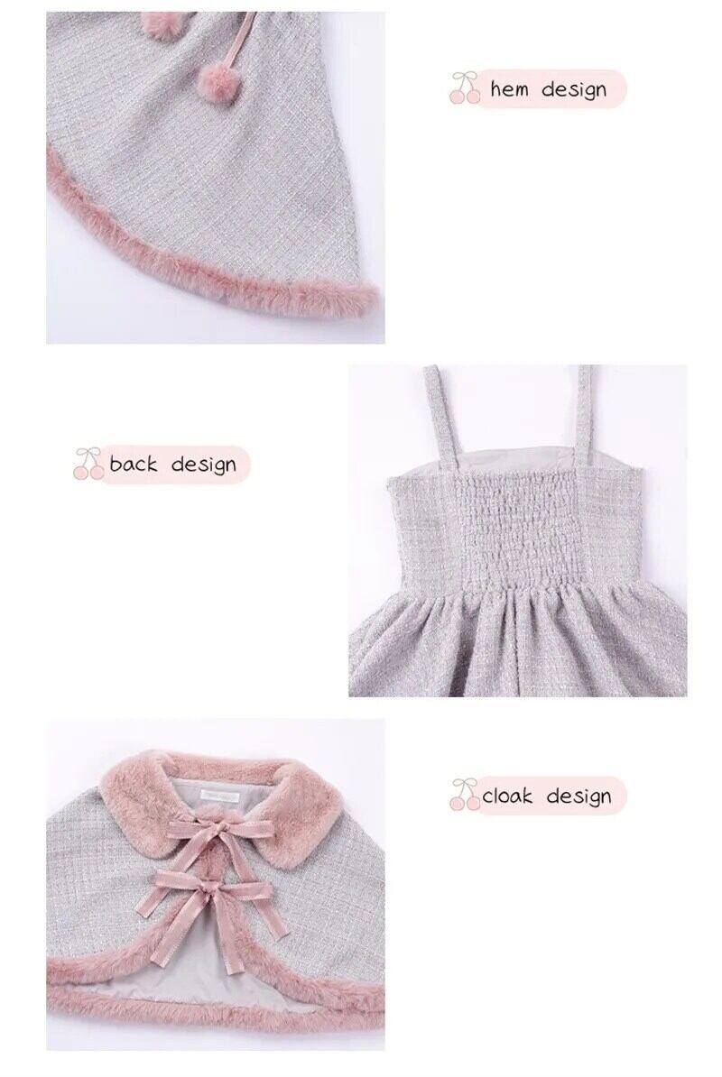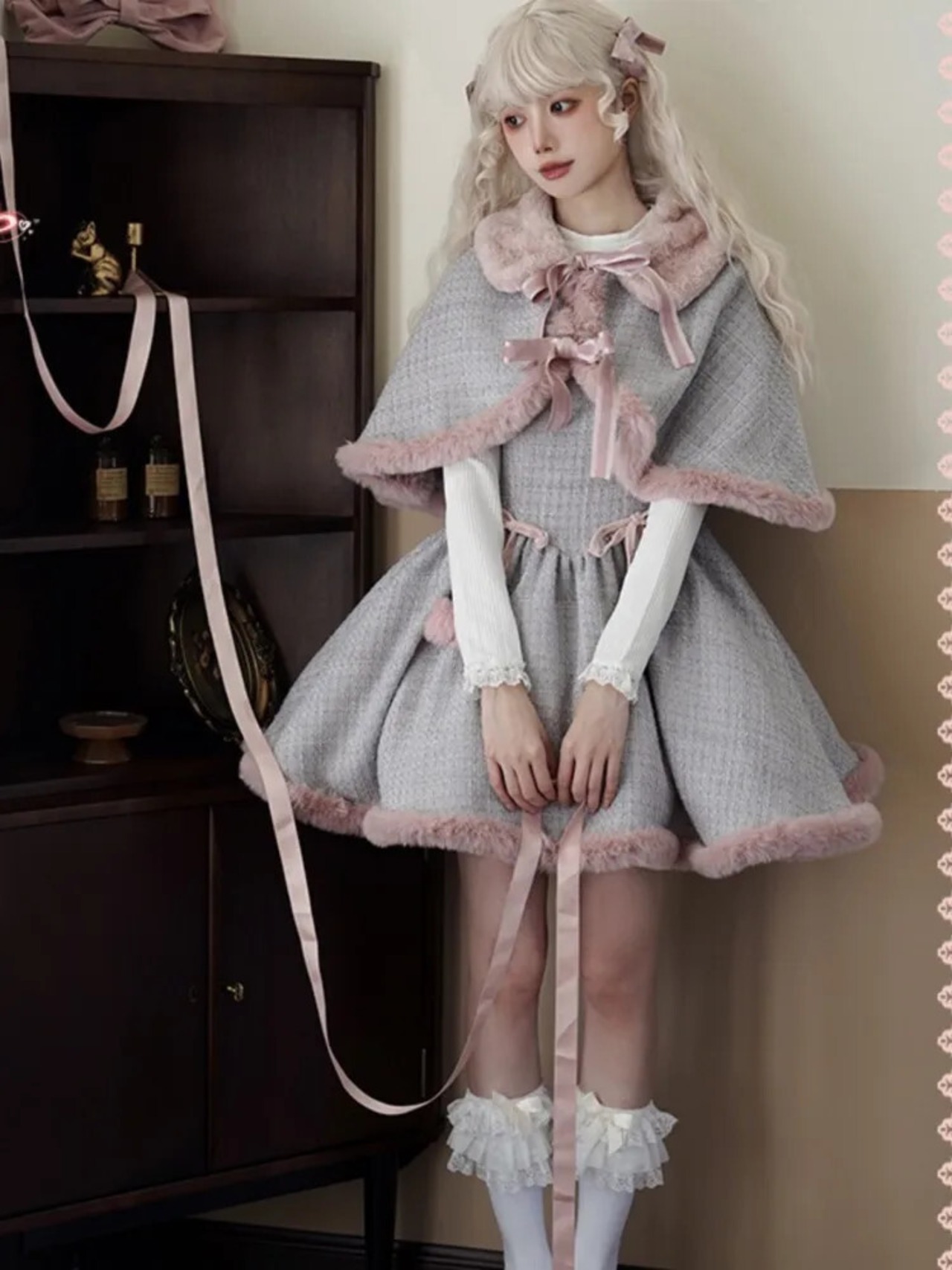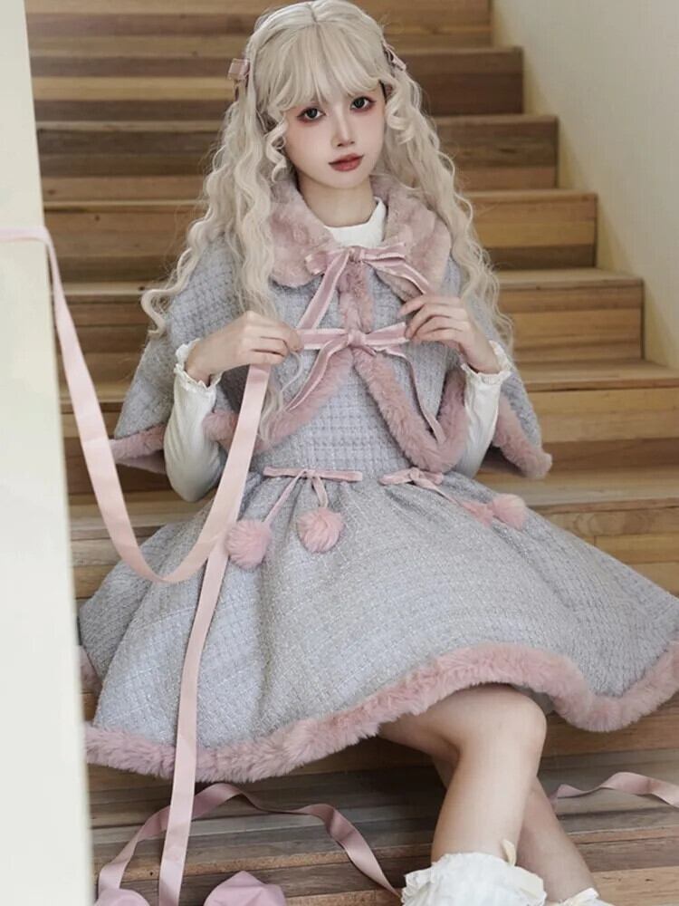冬豪華ロリータドレスセットツイードマント JSK セットスウィートガール蝶ネクタイミニドレス + フェイクファーケープスーツ リボン 大人ガーリー キュート カジュアル ウィンター 冬物 | aliel