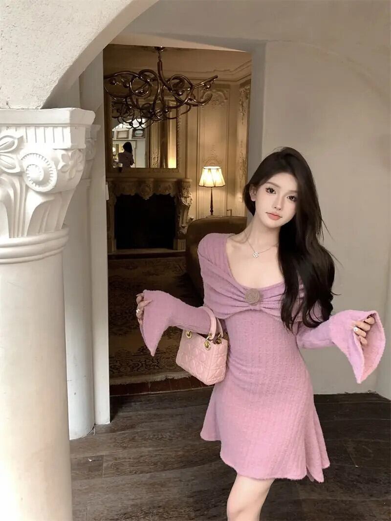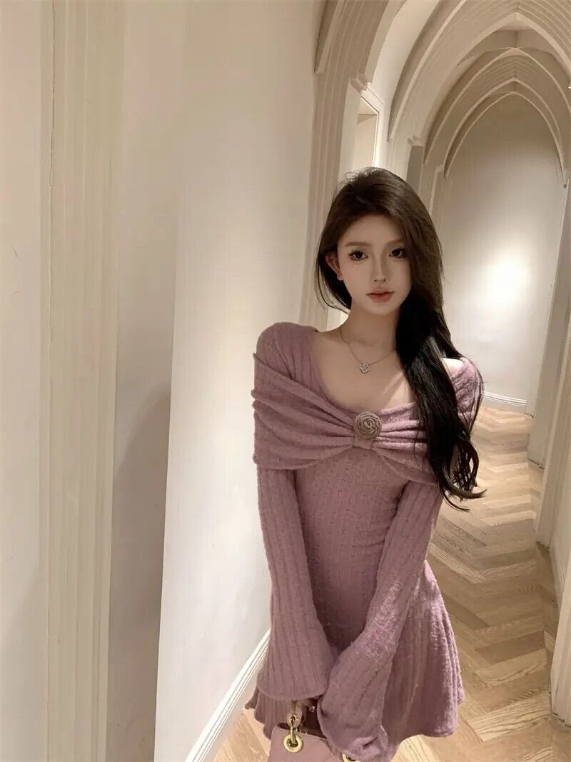 Sense Niche オフショルダー ソリッドカラー ニット ショートドレス スウィート ベル スリーブ スリムフィット 長袖ドレス ロング ベルスリーブ 大人ガーリー キュート カジュアル | aliel