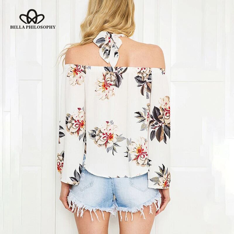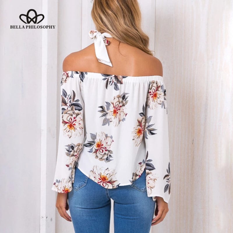 Bella Philosophy 花柄オフショルダー シフォン ブラウス トップス ホルター クール長袖シャツ セクシールーズ ホワイト ブリュサ ロング