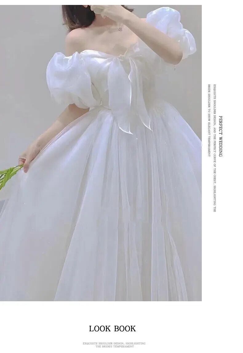 ホワイトスウィートメッシュドレスボウパフスリーブミディドレス秋イブニングパーティードレス リボン 大人ガーリー キュート カジュアル オータム 秋物